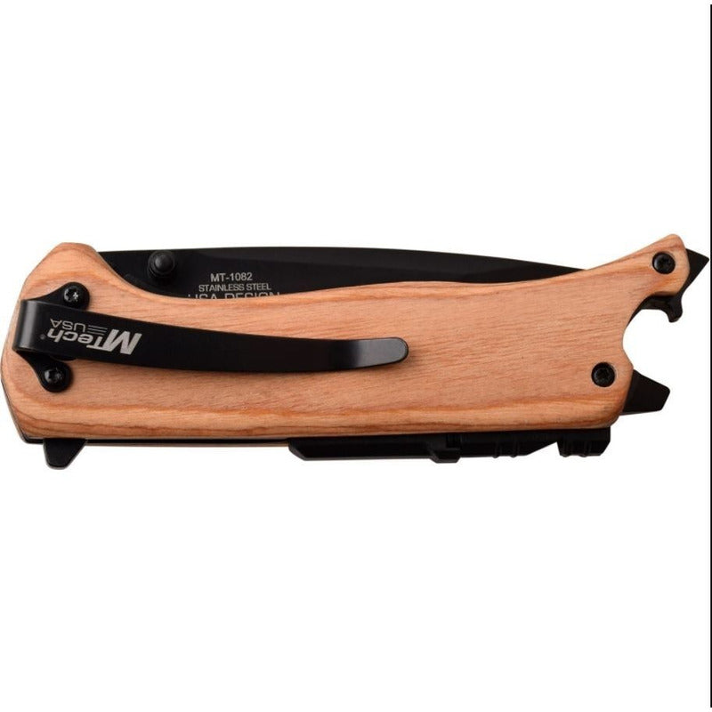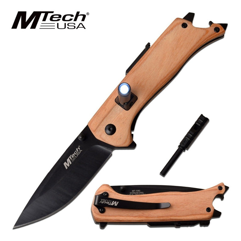 La navaja MTech 1082N cuenta con una hoja drop point 3Cr13 de 3,25 pulgadas / 8.5 cms con un acabado negro. Es de apertura manual con navaja con bloqueo cuando esta abierta. Esta navaja tiene cachas de madera con un clip de bolsillo, luz led, abrelatas, piedra para hacer fuego (pedernal) y un orificio para cordón.
