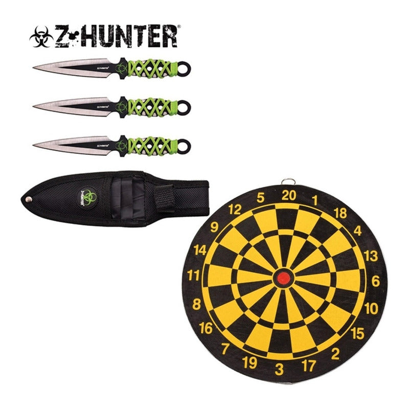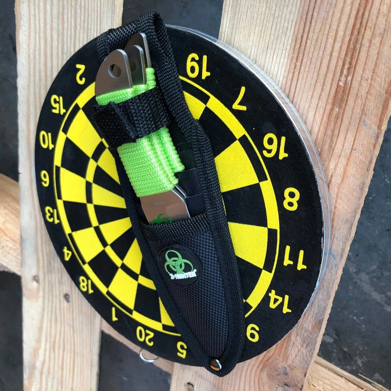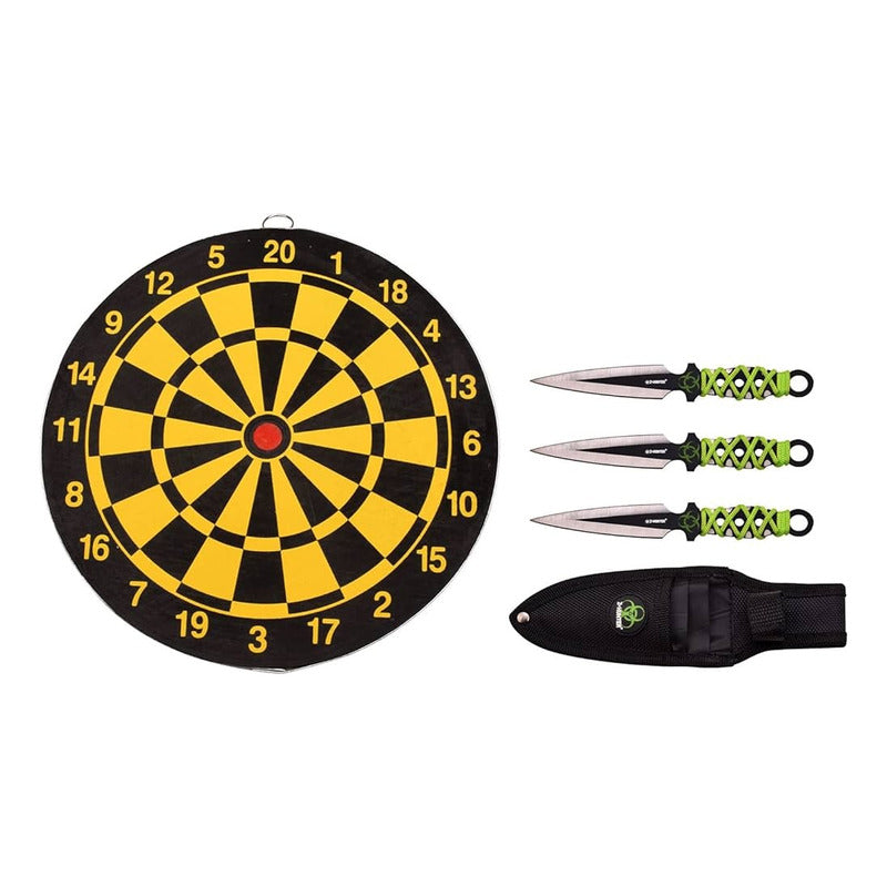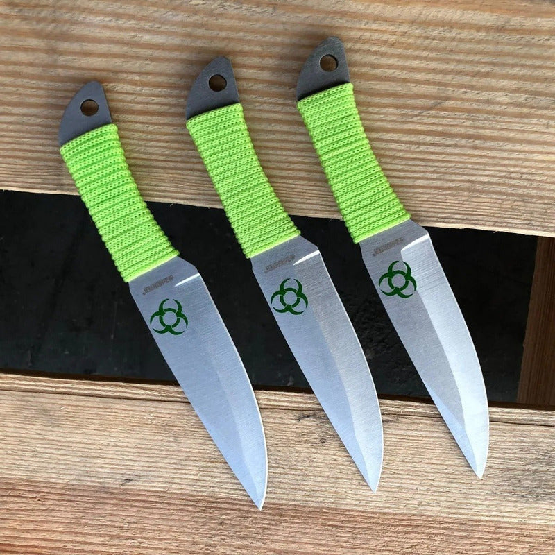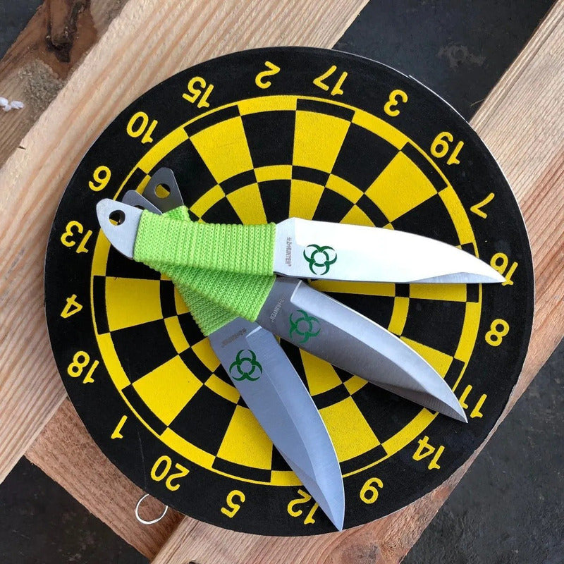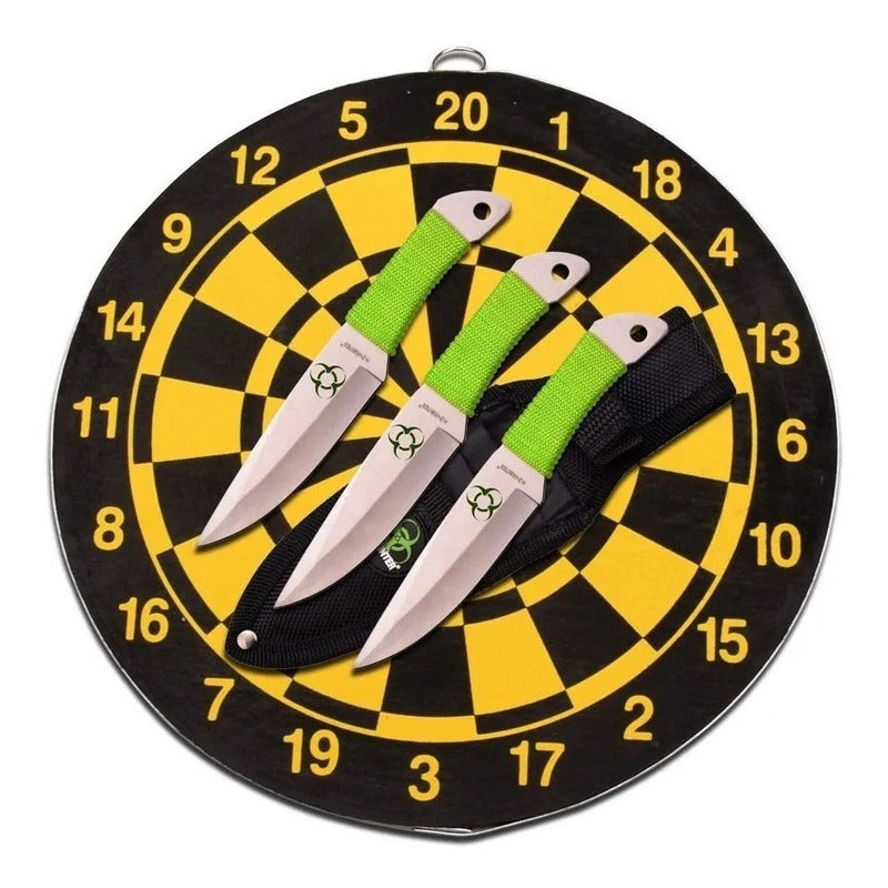 • Características especiales: Juego de cuchillos de lanzamiento con tabla de objetivo, juego de 3 cuchillos de lanzamiento, cuchillas de acero inoxidable con acabado satinado, con gráfico de riesgo biológico, asas de acero inoxidable envueltas en cordón verde. Construcción de espiga completa, bien equilibrada, incluye tabla de objetivo y funda de nailon negro para un transporte fácil y seguro.