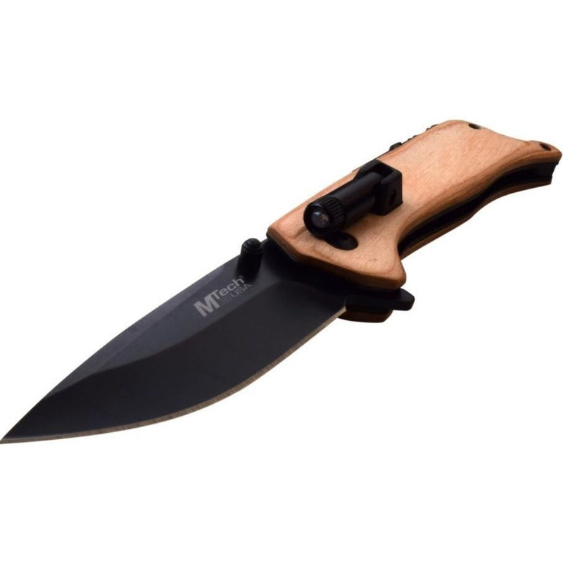 La navaja MTech 1082N cuenta con una hoja drop point 3Cr13 de 3,25 pulgadas / 8.5 cms con un acabado negro. Es de apertura manual con navaja con bloqueo cuando esta abierta. Esta navaja tiene cachas de madera con un clip de bolsillo, luz led, abrelatas, piedra para hacer fuego (pedernal) y un orificio para cordón.