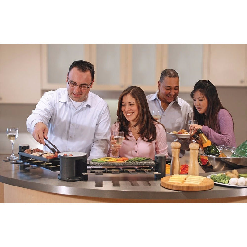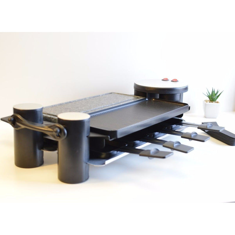*INCLUYE 8 PLATOS DE RACLETTE ANTIADHERENTES ,8 ESPÁTULAS RESISTENTES AL CALOR Y MANUAL DE USO CON RECETAS.