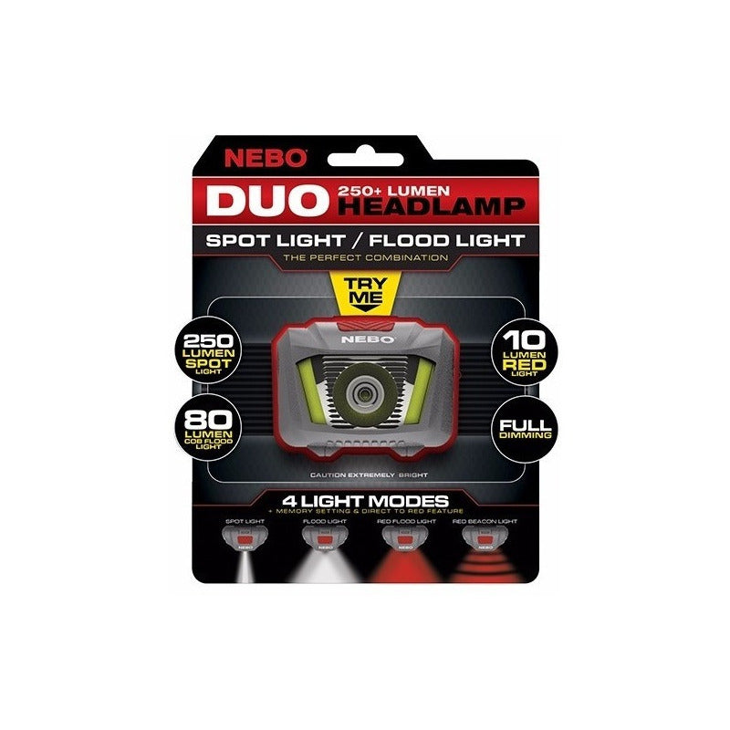 El faro NEBO DUO es una solución de iluminación todopoderosa y de manos libres. El botón de encendido / apagado del botón le permite desplazarse fácilmente a través de los CUATRO modos de luz: un LED blanco (250 lúmenes), tiras de 2 C • O • B (80 lúmenes) o 2 tiras ROJAS C • O • B en constante o baliza modo. El LED rojo es una luz de baja firma, que garantiza el sigilo en la oscuridad, mejora la visión nocturna y hace posible la lectura en poca o ninguna luz. La luz del LED de potencia de 250 lúmenes tiene una distancia de haz de 122 metros. Su diseño exclusivo de 2 franjas C • O • B ilumina completamente su área inmediata con su amplia viga de inundación. El faro frontal DUO es resistente, fiable, ligero y completamente resistente a los golpes.