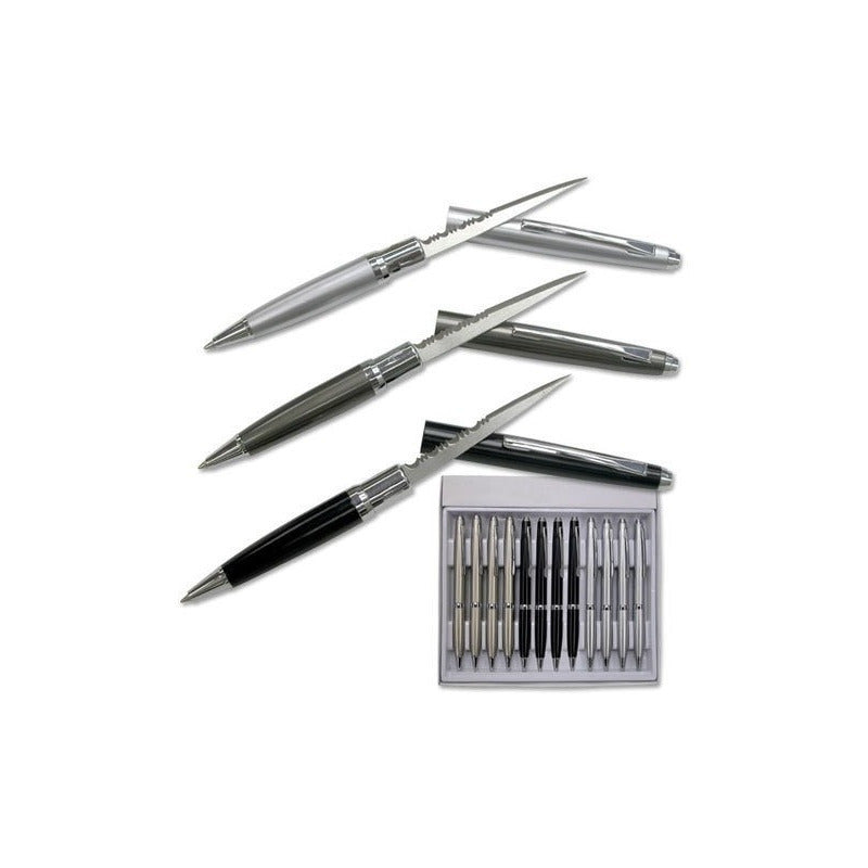 Una docena de bolígrafos y abrecartas recargables. Con hoja de 7.5 centimetros. Color negro, plateado y gris. Recibirá 4 de color negro, 4 plateado y 4 gris.