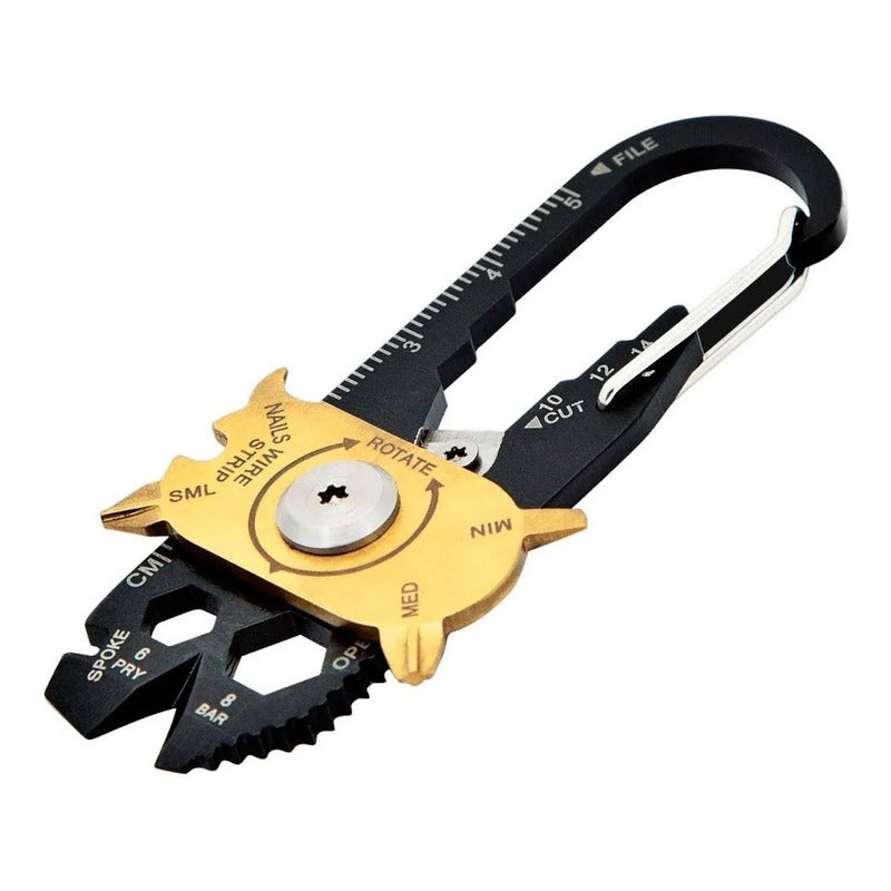 ¡20 herramientas en 1! Esta herramienta de mosquetón patentada simplemente se fija a su llavero o bolso.