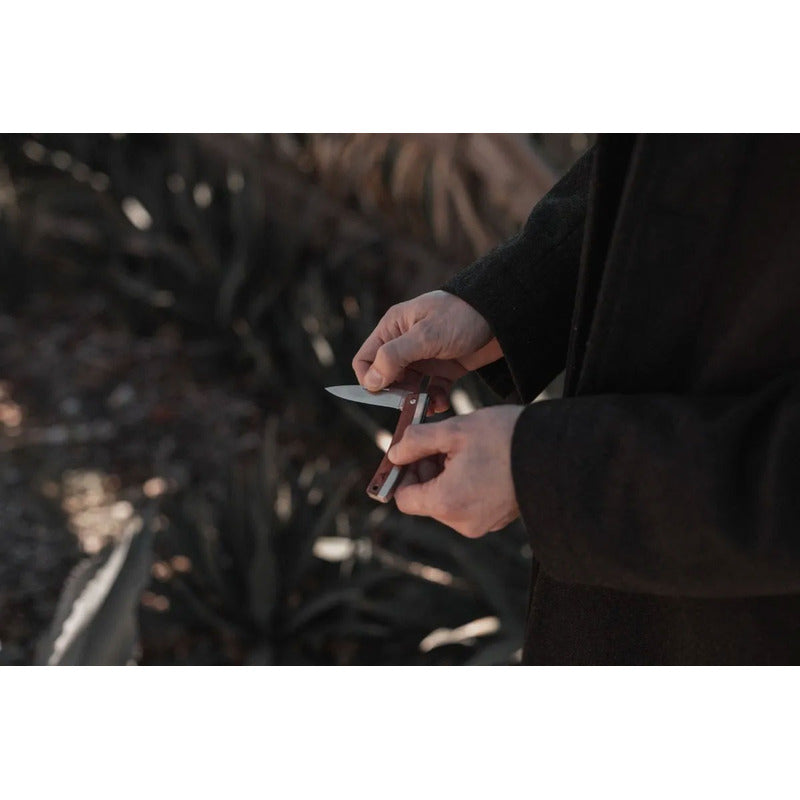 El mango curvo de acero inoxidable y palo de rosa real se siente como en casa en su mano mientras rinde homenaje a la fabricación clásica de cuchillos.