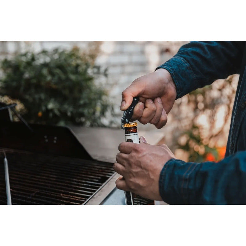 Versátil mosquetón integrado también funciona como una palanca, destornillador y abridor de botellas.
